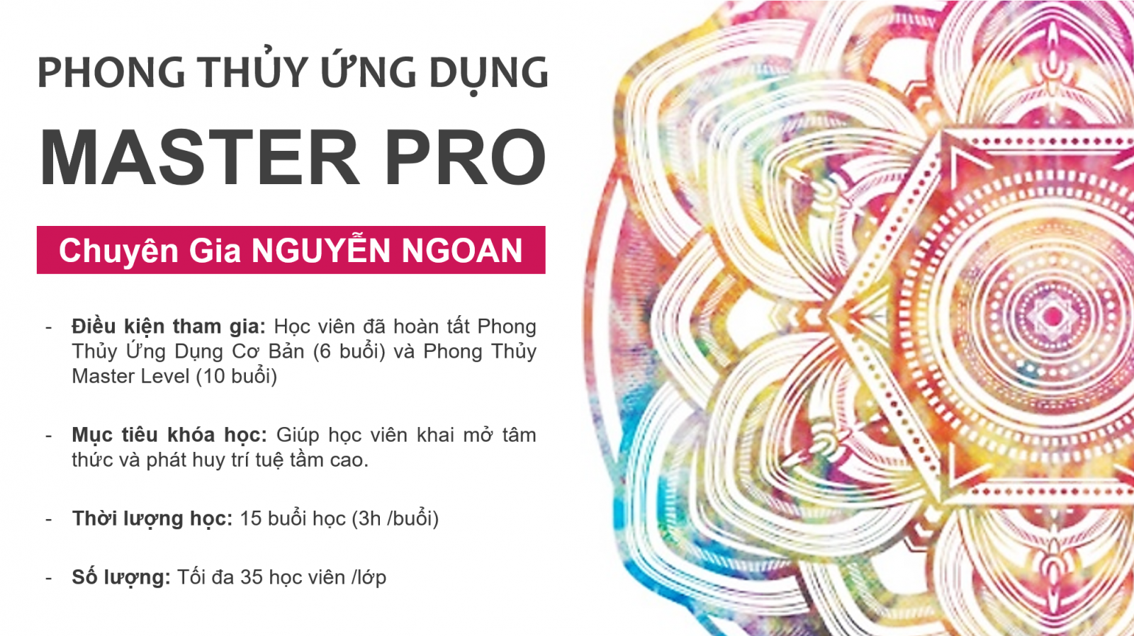 - Điều kiện tham gia: Học viên đã hoàn tất lớp Phong Thủy Ứng Dụng dành cho Doanh nhân (6 buổi)
